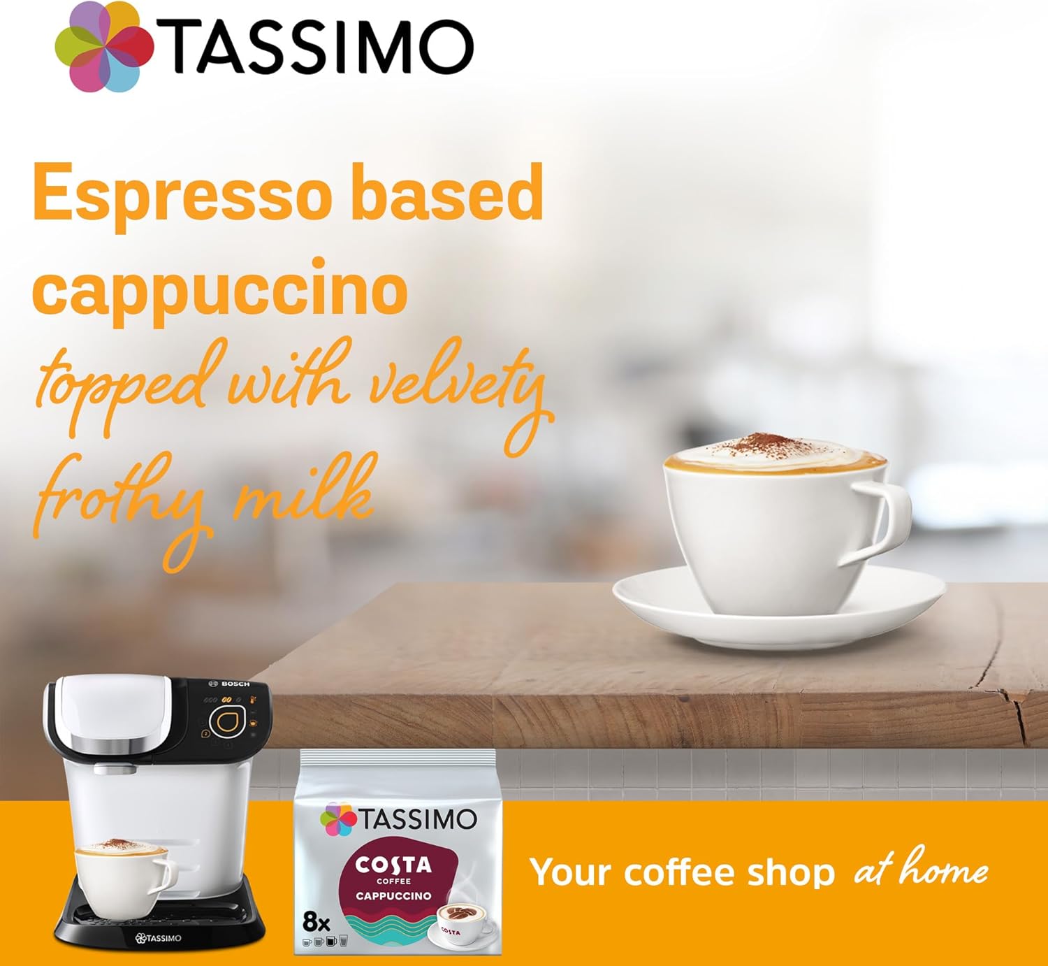 Enjoy the indulgent taste of a coffee shop favourite at home with Costa Coffee Cappuccino pods designed for **Tassimo machines. This smooth and creamy cappuccino combines rich espresso with frothy milk for a perfectly balanced and satisfying drink every time.